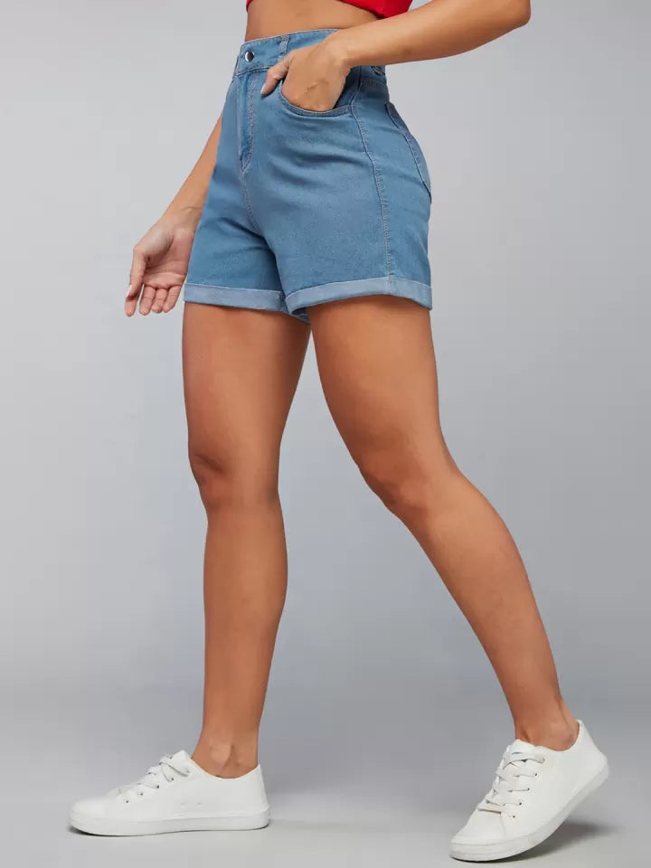 Blue solid mid-rise denim shorts, has 5 pockets, button closure